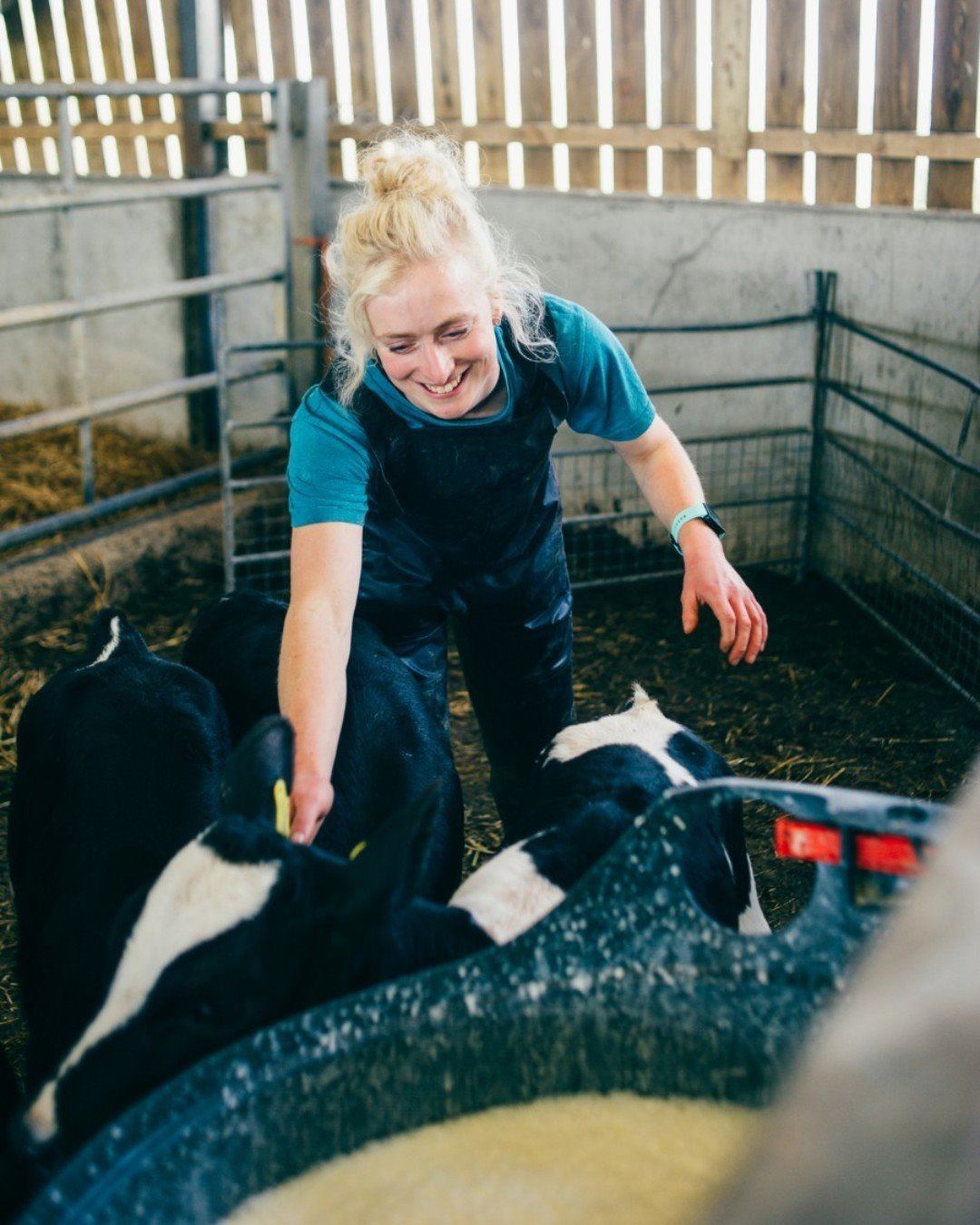 Kirsten, a livestock specialist, feeding the cows their morning “yogurt.”