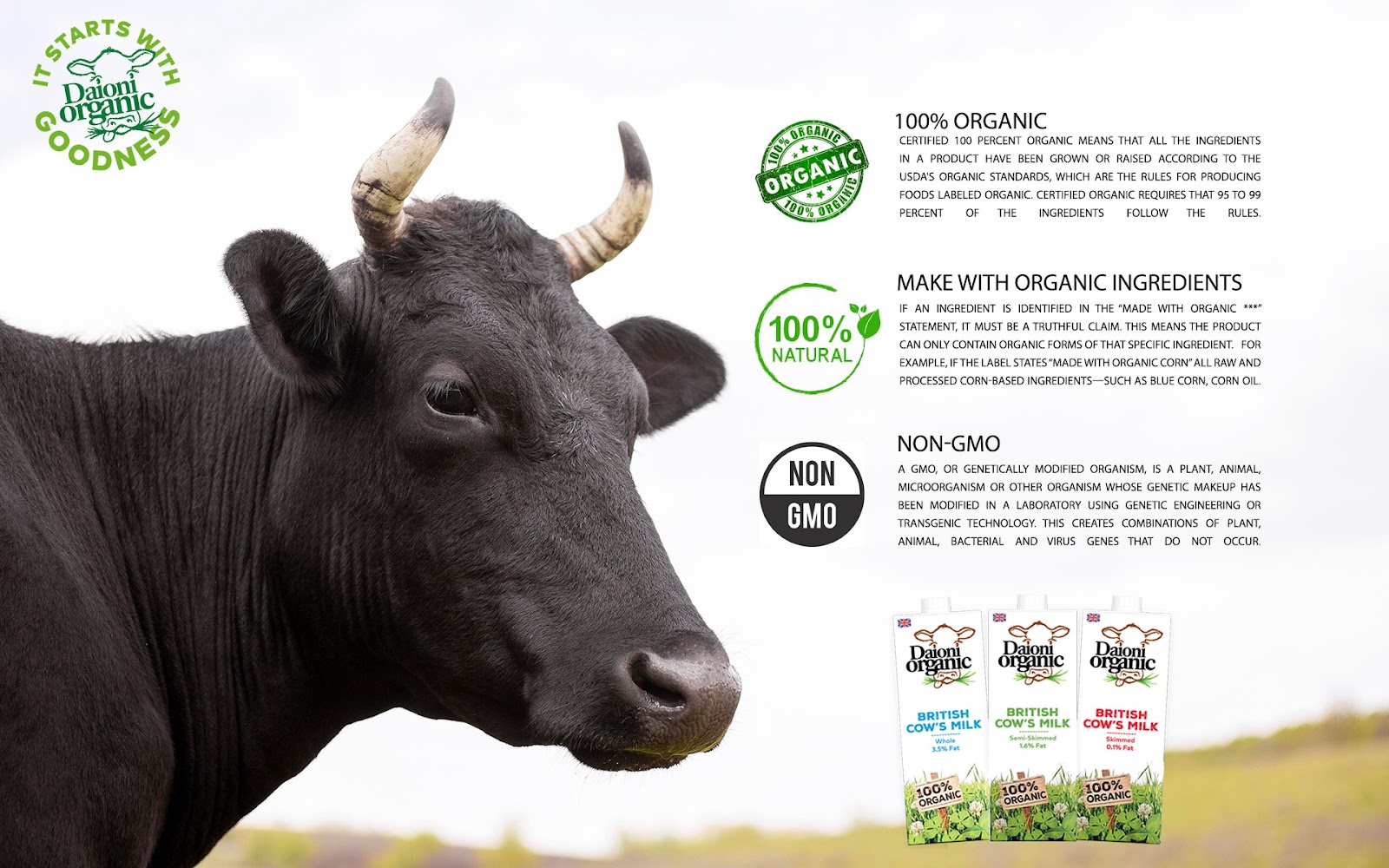 All Daioni Organic products are 100% produced and packaged in the United Kingdom, certified by the UK’s leading organic authority — The Soil Association. This means no antibiotics, no synthetic hormones, no harmful pesticides, and no GMO ingredients. All Daioni milk products are fully traceable from farming to processing, production, packaging, and distribution.