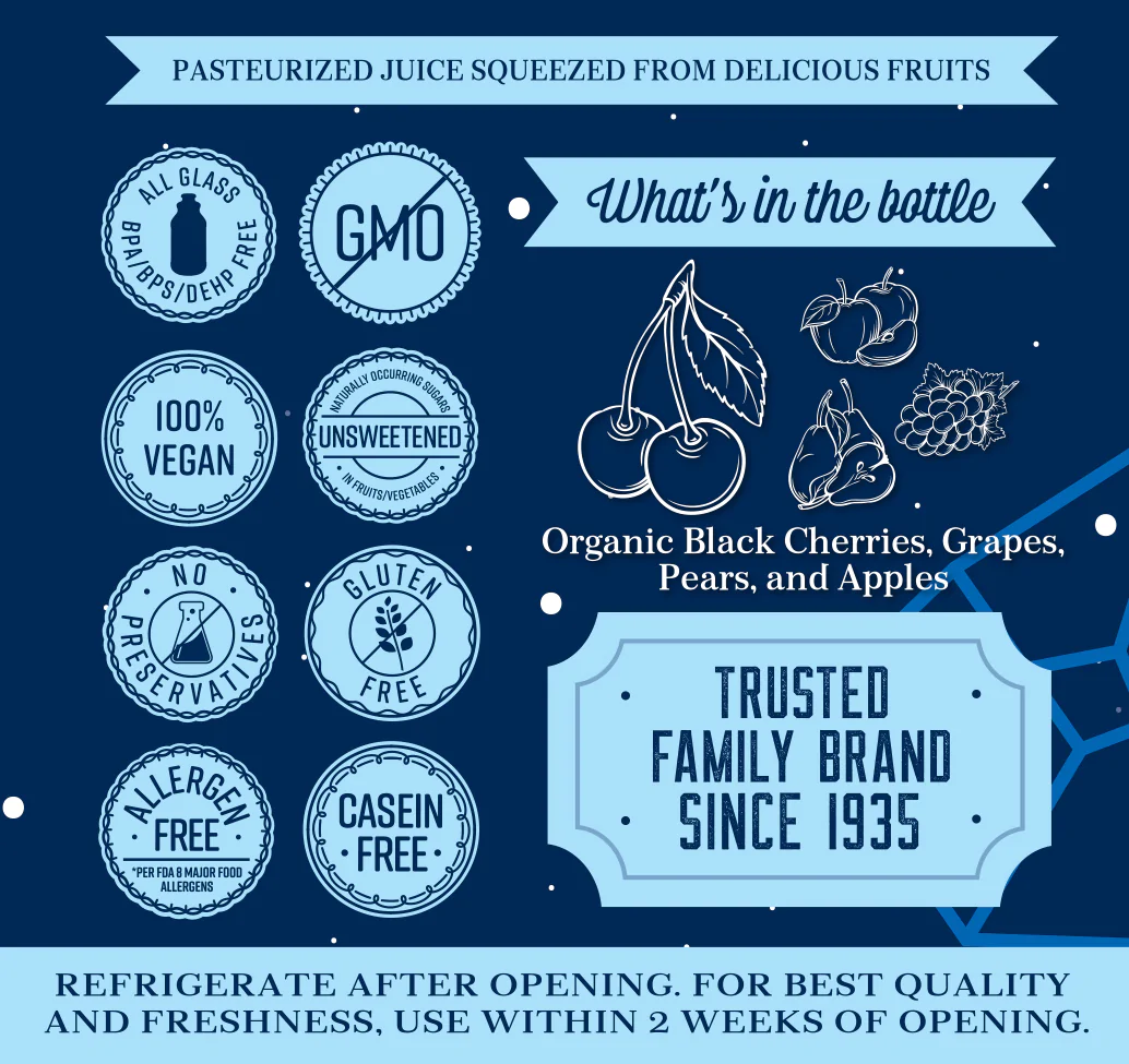 Lakewood organic black cherry blend juice is rich in vitamin C and antioxidants that help keep the body healthy. The essential micronutrients in the black cherry blend juice – Polyphenols and Anthocyanins – help support muscle relaxation and promote restful sleep. In addition, daily use of organic black cherry blend juice helps maintain normal cholesterol levels and supports urinary tract health, strengthens the immune system, helps restore important electrolytes in the body, and supports metabolic processes.