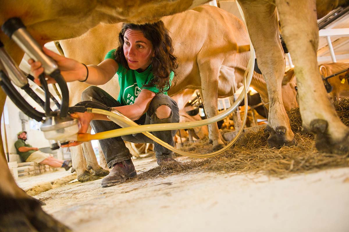 Cô Melanie Webb – nông dân tại Trang trại Stony Pond ở Vermont của Organic Valley – đang vắt sữa bò