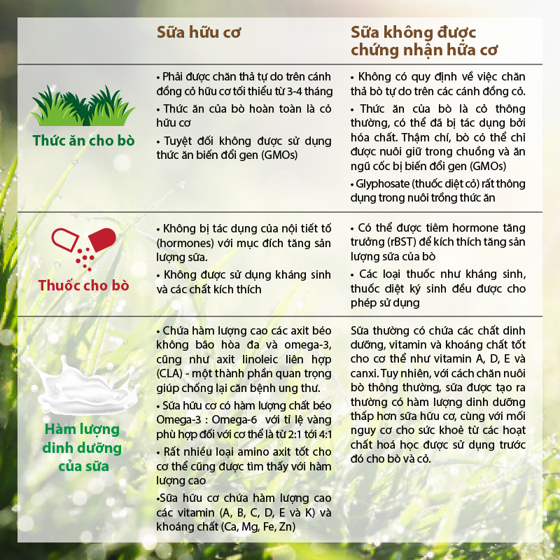 Câu chuyện bắt đầu từ những cánh đồng cỏ, quy trình chăn nuôi đến các chú bò – thành phần chủ chốt trong việc tạo ra những dòng sữa chất lượng, và cuối cùng là hàm lượng dinh dưỡng. Bảng dưới đây so sánh sự khác biệt trong quy trình tạo ra những sản phẩm sữa hữu cơ và sữa không được chứng nhận hữu cơ cùng những lợi ích dinh dưỡng mà các dòng sữa này mang lại: